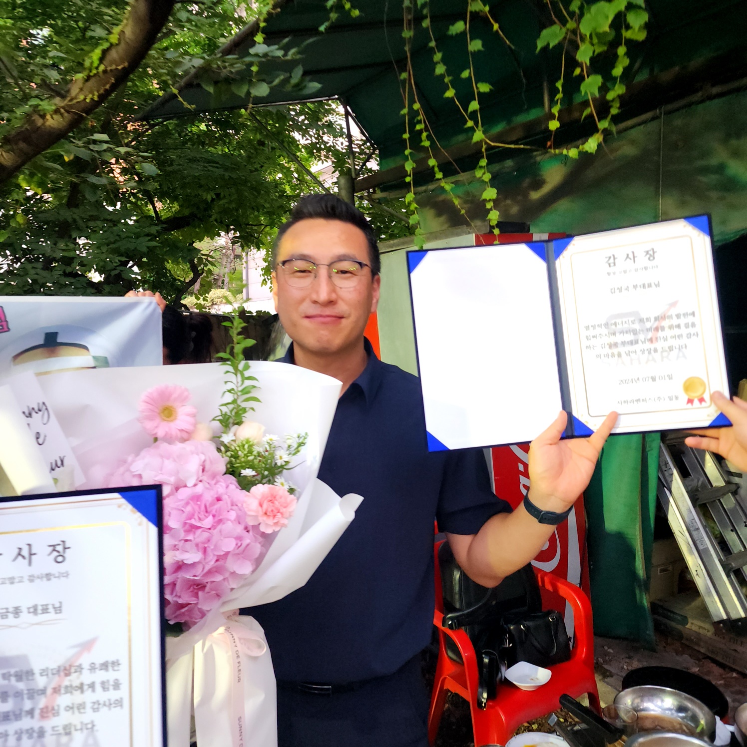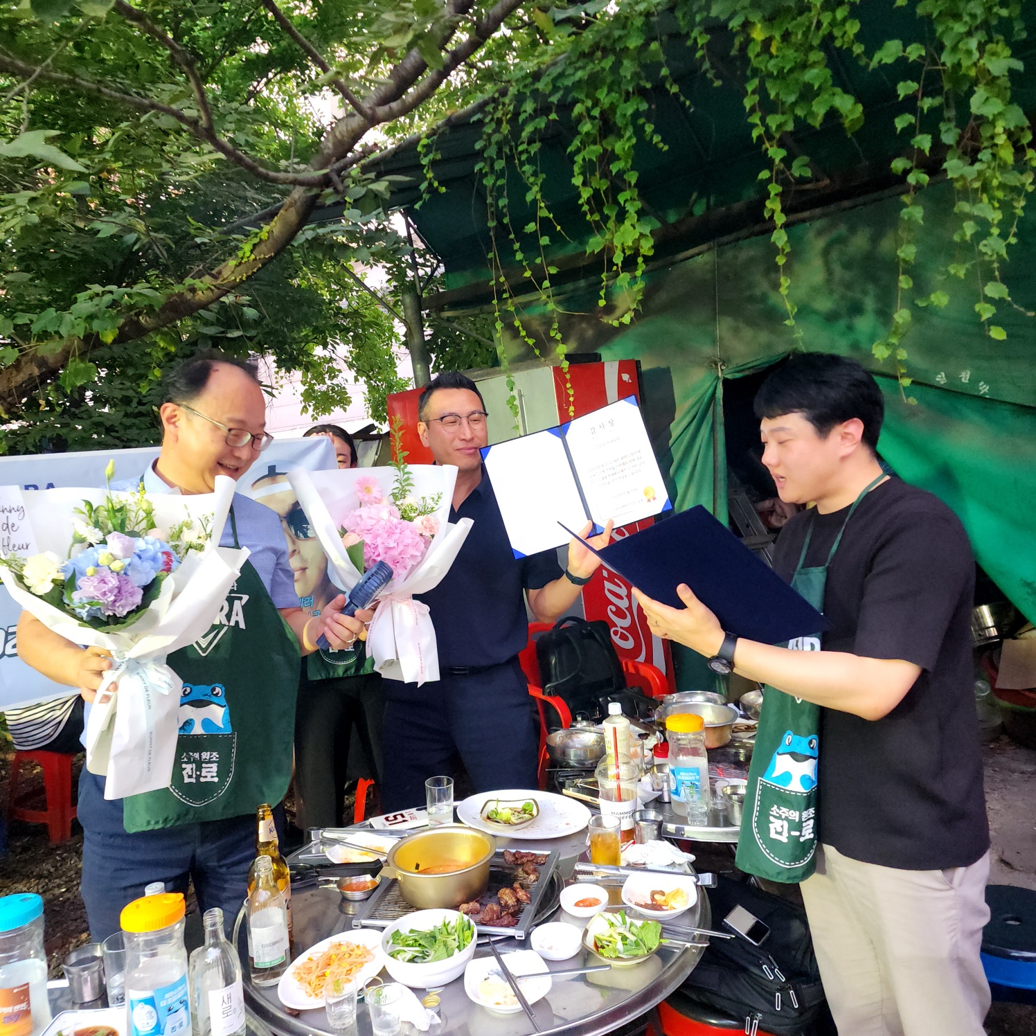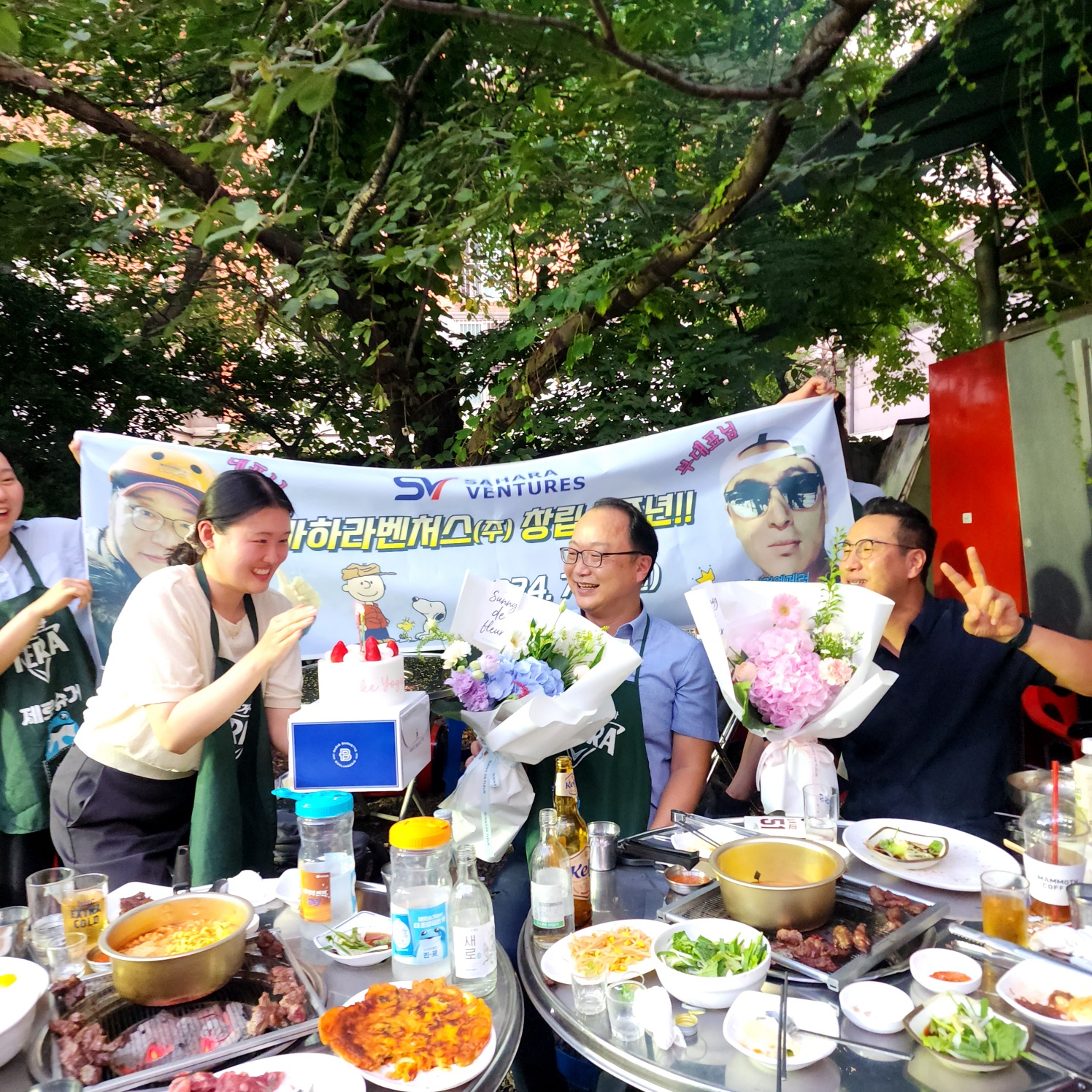 야외 회식자리에 마련한 현수막, 꽃, 케익!